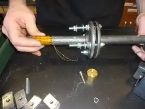 The purpose of this step is to form the barrel of recyclebot. The barrel will have a bearing end, a mouth, a juncture (thermal break), and a nozzle. The mouth of the barrel will be referred to as the front side of recyclebot; the opposite, solid surface will be the back side. The barrel will house the feed screw, which should retain free movement throughout the assembly process until the motor attaches to the feed screw; it is important to continually ascertain and adjust the positioning of all components during this step and the following steps to ensure this free movement.