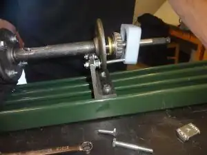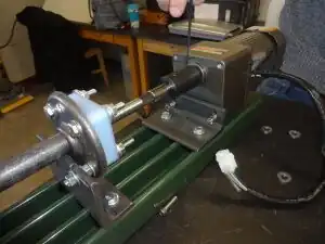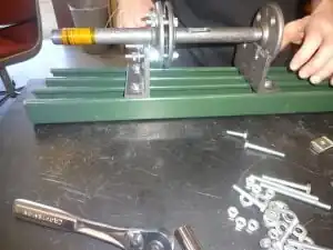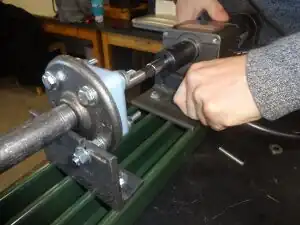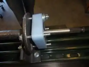 - (i.) Using a wrench to grasp the spacer nut and either a wrench of socket set to grasp the interior nut, tighten the nuts on either side of the bearing-end barrel bracket. Insert the feed screw continues to move and rotate freely in the barrel.