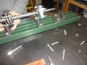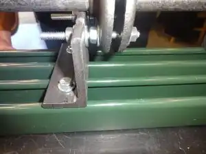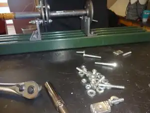 12. Tighten bolts on bearing-end barrel bracket. Keep in mind: you may need to loosen these bolts during step 22 to ensure the entire barrel-and-feed-screw unit are in horizontal alignment with the motor shaft. (See Photo 18)