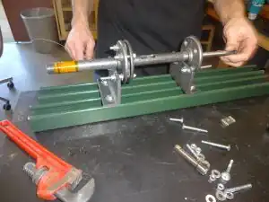 - (ii.) Grease the tapered roller bearing (alternatively, you may grease it immediately before a final tightening of all components). Every surface of the roller bearing should be thoroughly greased—you must force grease into all of the rolling elements of the tapered roller bearing while avoiding air bubbles in the grease. For a demonstration, you may find video tutorials on 'how to grease a roller bearing' online.