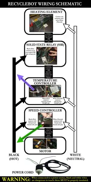 Before beginning the wiring, keep in mind that black and white wires are power wires and the green wire is the ground wire. You will need approximately 10 feet of insulated copper wire. For each connection, measure the appropriate amount for your desired set up (that is, for the distances determined by where you want your final placements of each component of recyclebot). When stripping wires, you do not want to strip them back any more than ¼" so that the stripped portion of the wire will not extend beyond the connection pads.