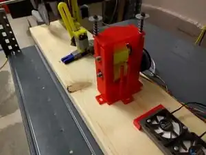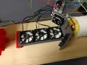 Currently, the cooling section is comprised of 5x50mm CPU fans arranged in such a way to maximize airflow around filament, see figures aside. This fan assembly is attached to the board via a magnetic mounting system. This system has a base that is adhered to the board, with magnets both in the mounting plates and the fan assembly. This system has been designed to feature a modular effect with switching cooling unit assemblies, particular the water bath assembly that will be released in Recyclebot v5.1.