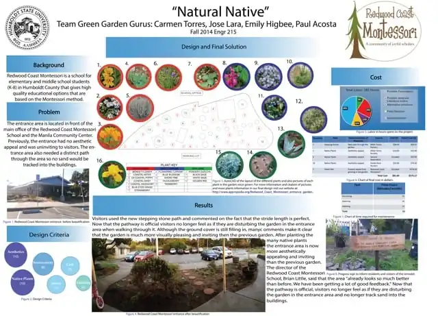 Redwood Coast Montessori and the Manila Community Center allowed Cal Poly Humboldt's Fall 2014 ENGR215 Introduction to Design class to implement several student-designed projects that benefited the community. The Wayfinding Entrance Garden project's main objective was to create an attractive, inviting entrance for the school that included native plants. The inclusion of edible plants was also a consideration in the design. The garden was envisioned as a place where students might be able to learn about the care of a native garden while enjoying the sights, smells and tastes of the plants.
