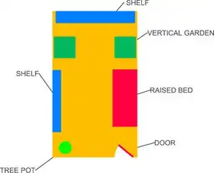The name for the final design of the greenhouse is the "house of greenery". The house of greenery meets the criteria and specific needs for the Redwood Coast Montessori greenhouse. The design includes a raised bed on the south side of the greenhouse to accommodate larger plants. Directly above that is a high shelf that is used by teachers and other faculty members. To provide educational value for the students at Redwood Coast Montessori, the greenhouse gremlins implemented two vertical gardens and a side shelf to show different growing methods. The tool rack stands near the entrance of the greenhouse for small shovels and other hand tools for gardening.