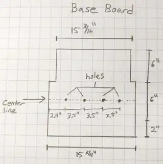The finish line placement mechanism is constructed from wood, with a sturdy metal housing used for the gate portion. Begin by measuring the width of the metal box to be used as the gate housing. Cut a piece of ½" plywood that spans the width of the metal box to be used as a base, and extends 6" out of the back, and 2" out of the front. Draw a line across this board directly in the center of 6" metal housing, which is 9" from the back and 5" from the front. Drill 4 holes on the center line, starting at 2.4" from the side, then space each hole 3.5" from the previous hole, see Figure 5-12.