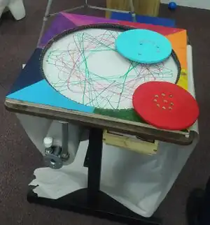 The purpose of this project was to create an interactive exhibit based on the original children's Spirograph toy using both new and upcycled materials. The design was to be a table top spirograph system that children could use to create geometric patterns on paper that they could take home with them.