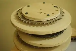 The "COGS" of the Inspirograph are created from reused bicycle cogs. These bike cogs are sandwiched in between two circular cuts of plywood that act as protective coverings for the sharp parts of the gears. The plywood pieces and bike cog are spaced apart with rubber grommets to allow some flexibility in the movement of the inner cog on the track. This creates the appropriate spacing giving the cog an easy rotation along the bike chain. Along the top plywood piece holes are drilled in the shape of a Fibonacci spiral; this provides a place to put a writing implement. Using a Fibonacci spiral in pen placement allows the user to create different designs depending on which hole they use to draw with.