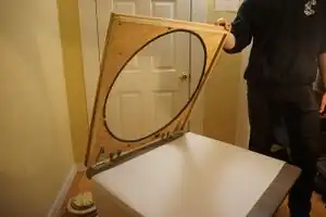 The "HINGED GEAR SURFACE" of the Inspirograph is made from a sheet of plywood that has been attached to the table surface with two hinges. In the center of the plywood sheet a circular hole was cut to mount the bicycle chain and create the space for the user to draw the spirograph design. The hinges are utilized to allow the user to easily lift up the surface of the spirograph and replace the writing paper. Simultaneously this provides a piece which holds the paper taught when drawing.