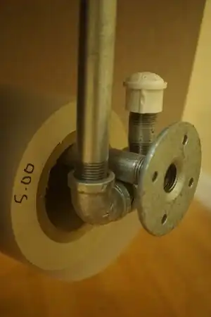 The "HOOK & PAPER ROLL MOUNT" is a galvanized steel hook that was used to create a durable and easily maintained paper roll holder. The hook holds a steel pipe which threads through a roll of paper. This allows the paper roll to be lifted out and replaced easily while reducing friction from rolling out the paper. The roll is held in place by two galvanized steel flanges screwed to either side of the metal pipe and once unscrewed, the paper roll can be easily replaced.