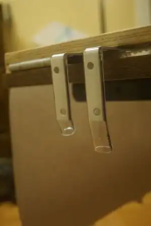 "MARKER STORAGE BOX" is pictured here. The concern that the Inspirograph markers would go missing resulted in the creation of a storage box. The box was placed on the underside of the tabletop for easy access and can hold up to 40 different colors.