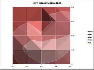 Another important realisation was that the increase in light intensity with the addition of a diffuser was more significant than simply adding a reflective shield above the light. The canvas shade increased the light intensity far more than any of the investigated materials. As such an aluminum diffuser would most likely provide the most effective increase in bare bulb lighting efficiency.A crude example of this was constructed out of aluminum foil as shown in figure 19, the resulting intensity plot is shown in figure 20. The light intensity is increased by as much as 150 lux at some grid locations. In order to optimise the shape of the diffuser it would be helpful to use a Ray trace optics software to determine the ideal diffuser angle, length etc.