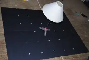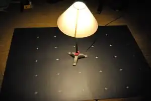 In order to determine the effectiveness of the investigated materials a small test site was set up. It consisted of a 1m x 1m grid set up on a black surface. A light source was placed in the middle, twenty five light intensity measurements were taken for each material option. The light source was a 60W light bulb and it was 54 cm above the test surface. This setup is shown in figure 5 (please note that the lamp shade was not present during all tests).