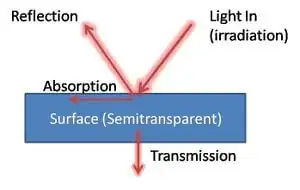 When light hits the surface of a material it has three options; it can be reflected, absorbed or transmitted as illustrated in figure 3.[4] In order for transmission to occur the surface must be semitransparent/translucent or fully transparent. This behaviour plays a large role in everyday life, reflectivity and absorption are the primary contributors to colour. The colour of an object is dependent on which wavelengths of light are being reflected and absorbed on its surface. Different combinations of reflection and absorption result in different colours.