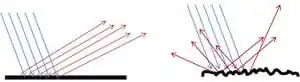 For the purpose of this project reflection is the most important aspect since light intensity of the bulb will increase in proportion to the reflective properties of the reflector. There are two different types of reflection, spectral and diffuse. Figure 4 illustrates the difference between these two types of reflection. Diffuse reflection occurs on rough surfaces, when a beam of light hits a rough surface it is broken up and reflected in many different directions.