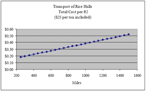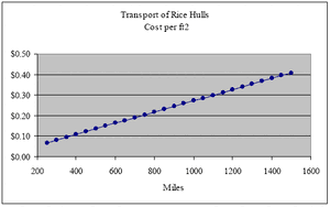 Perhaps the most significant cost associated with the utilization of the rice hull is its transport. At a bulk density of about 9 lbs. per ft3,[31] loose hulls can be transported at roughly the same cost as baled straw. However, to reduce the cost of transport, rice hulls can be compressed to as much as 25 lbs. per ft3 without destroying their elasticity.[32] They readily bounce back to their original density once the force of compression is removed. But to transport rice hulls economically, it would not be necessary to compress rice hulls to a density of 25 lbs/ft3. At a density of only 14.50 lbs/ft3, a standard 53-foot trailer attains optimal transport efficiency at its maximum legal weight of 24 tons. If, at this transport density, we pay an average trucking fee of $1.45 per mile, it would cost approximately $15, $30, $45, $60, $75 and $90 to transport one ton of rice hulls 250, 500, 750, 1000, 1250 and 1500 miles respectively (see graph below).