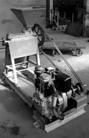 Technical sheet Production schedule: 250kg/h for a recommended motorization of 15CV (~ 11kW) Training: only the manual Use: business use; for small or medium communities Maintenance: lubrication of bearings, regular maintenance of engine, replacement of worn parts: drums and knives Features: low cost manufacturing, simple manufacturing techniques, robust