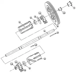 Rep.Qty.Nr. Designation Material Standard 1 1 03-001 axis Ø 2" h7 steel Ck45h7 2 1 03-002 primary hulling cylinder white cast iron 3 1 03-003 secondary hulling cylinder white cast iron 4 1 03-004 pulley drivetrain cast iron FGL 250 5 1 03-005 nut primary cylinder cast iron FGL 250 6 1 03-006 nut secondary cylinder cast iron FGL 250 7 1 hexagonal screws M10 x 40 Ac 8.8 DIN 934 8 2 03-007 seal (waterproof leather washer) leather 9 1 03-008 end key DIN 6885-A 12x8x120 steel Ck45 10 1 03-009 central key DIN6885-A 12x8x56 steel Ck45 11 2 bearing en fonte a semelle 12 2 kit thightening manchon