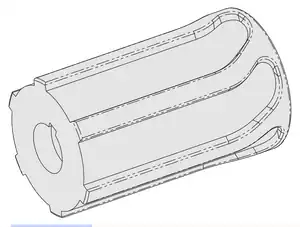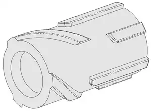 This piece must be very durable. It must have a strong resistance against wear and scouring. The non-hulled rice is indeed very abrasive and cylinders wear fairly quickly. As such, it is molded in white cast iron, ie to obtain a significant hardness from the creation of a piece cooled in ordinary cast iron (which is gray cast iron, see the standards in Appendix 3), we must ensure a rapid cooling of the cast iron in the mold. Therefore, it we cool it, not in a sand mold but in a steel mold or by casting. We then talk of cooling in a metal shell, which requires a bit of little specific know-how. The rapid cooling of molten iron acts acts as a quenching. The hardness of the finished piece is about 30 HRC (or 96kg/mm ²). The difficulty with this method lies with the creation of the of the shells. For this part, the molds were created through a regular cast (white cast iron, see the standards in Appendix 3). We had to cut the the mold in 3 sections of 120 degrees and modify the outer side to allow their insertion in the sand model. Codéart can help you for the realisation of this piece, or even give you one.