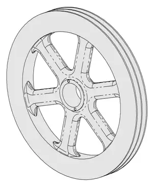 This piece is molded in cast iron and has no partcular mechanical features. The central hole is conical and must be created on a lathe. The two gorges of belts are equally turned.