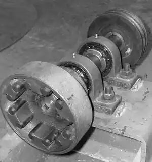 The engine is used at AECP is a Hatz engine (http://www.hatz.com). This diesel engine is often used on agri-food machines and rural areas. Like many others, it is not designed to withstand a radial tension on its axis, other than the tension of the belt induces a radial load on the pulley. With this type of engine, the pulley can not be mounted directly on the engine axis. We thus use for this case a coupling attached to the two intermediate bearings and support the driving pulley. This assembly is connected to the engine by a flexible coupling to correct a margin of misalignment.