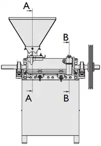 When the huller runs, we introduce rice into the hopper. The part of the rotor which is located below the hopper acts as an Archimedes screw, and "pushes" the rice to the other end of the rotor. Once some of the rice has passed into the body of the huller, it is driven by the horizontal stries of the central part of the rotor into a rotational movement.