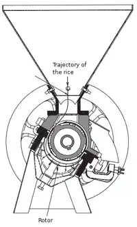 When the grains of the non-husked rice arrives at the knife, the space it has to move along (between the rotor and the knife) is heavily reduced. The knife opposes the rotation of grains. The chaff and the bran surrounding it then "rub" along the edge of the knife and the elevations of the rotor, leading to their separation of the grain by necking and scouring. This allows the husking of the rice. The level of scouring is set by the opening of the exit for the husked rice: the more it is closed, the more the rice is forced to stay longer in the device, which accentuates the shelling. The pieces in which the bran and the chaff are cut, are small enough to pass through the sieve.
