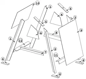 Rep. Qty. Number Name Material Standard 1 2 01-001 rear foot angle steel St 37 2 1 01-002 left front foot angle steel St 37 3 1 01-003 right front foot angle steel St 37 4 2 01-004 reinforcement sheet steel St 37 5 2 01-005 flat plate body support steel St 37 6 4 01-006 flat fixation plate ground steel St 37 7 1 01-006 left spar angle steel St 37 8 1 01-008 right spar angle steel St 37 9 1 01-009 front sheet steel St 37 10 1 01-010 rear sheet steel St 37 11 2 01-011 crossed angle steel St 37