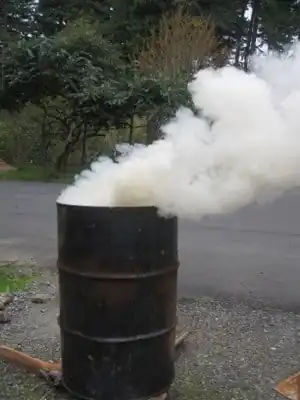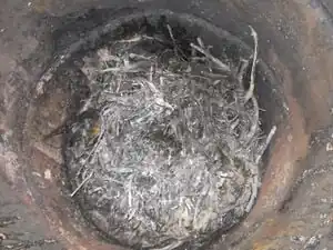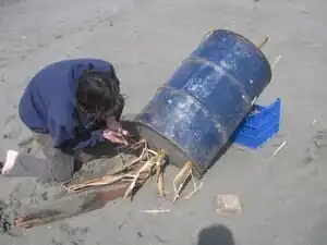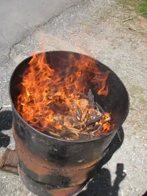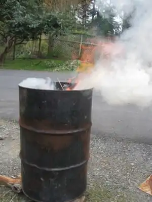 Kiln/vessel with lid for carbonizing, we used a 55 gallon drum (being cleaned in this image)