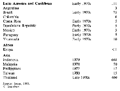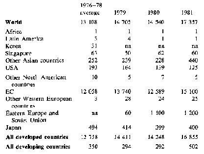 Only about 4 per cent of world starch production moves in trade and most of this is cassava starch: the major importers are Japan, the USA and Taiwan. However, in the USA home-produced maize starch is taking the place of cassava starch and in Japan the domestic starch industry is highly protected by quotas and tariffs, with the result that there has been a decline in imports of cassava starch in these countries. Only in Taiwan has there been an increase. Table 4 shows production of cassava starch and