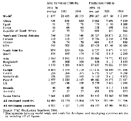 The best balance of these various factors has been found in temperate regions and is reflected in the high yields obtained in most European countries, the USA and Canada (Table 1). At the other extreme are the lowlands tropics where, until very recently, commercial production was virtually impossible. In tropical uplands the lower (though still high) temperatures, combined with short day-lengths, allow 'reasonable' yields to be obtained. Current trials with heat tolerant clones are showing much improved yields.