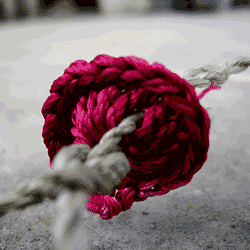 To make rope elements, one to two meters long and ending in a knot that loosely fits the pipe is an alternative for rubber or plastic washers slid over the pump rope or knots made at intervals in the pump rope. It would be women's work to make such rope elements in a handicraft way like Macramé. When hauling water, women can keep track of the wear of such rope elements and replace one element when necessary. This replacement can be done in a few minutes, there is no need to take the pump out of service. The picture shows a complex piece of macrame work. In a similar way the rope element should be made: thin rope, woven into a sting, a loop at one end and a thick knot at the other end. Each loop can be attached to the knot of the next rope element by inserting it into an opening in the knot. There the loop can be fastened.