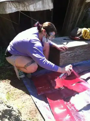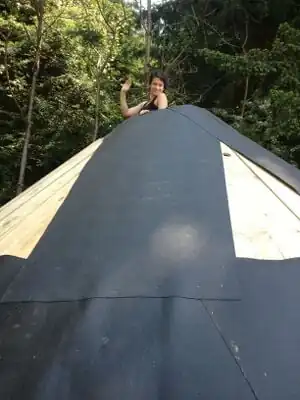 CCAT is the Campus Center for Appropriate Technology at Cal Poly Humboldt, in Arcata, CA. CCAT built its yurt to provide a demonstration of a sustainable housing structure. Yurts were originally built by nomadic peoples, and traditionally constructed to be mobile; this is not true of the CCAT yurt. The CCAT yurt was built to be a permanent structure on campus and was originally built with redwood shingles as its roofing material. When CCAT changed locations in 2004 this roof was replaced with a "weather proof" canvas roof. Unfortunately, in Humboldt County canvas rooftops often don't hold up to the elements. When this project came to us the CCAT yurt had a dangerous, black mold infested canvas roof. Our goal was to replace it with a water resistant, structurally sound, recycled roof. Recycled materials are a great product for roofing because many materials that are thrown "away" still have the capability to be used as something functional.