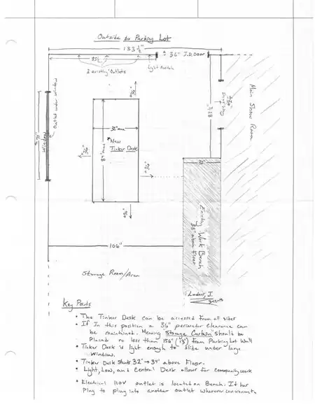 The Tinker Desk is an up-cycled desk and workbench that is designed to be used as a workspace for up to six users simultaneously, while maintaining a low-cost model that is easy to reproduce. The desk is held by two vertical legs that are braced by a central piece, ensuring that the base is sturdy, while also maintaining ample room for leg movement. The benches are designed to be roll-resistant, while the stabilizing brace ensures the desk is stable for moderate-to-heavy use. Every surface of the desk has been sanded to promote splintering-free edges and prevent fabrics and other materials from getting caught and splintering the wood. The legs of the table and benches also have fitted rubber feet to sit on. This will prevent wear on the feet of the workbench and reduce scratching on the floor of the workspace. The design is handicap accessible and was measured to a height that would fit directly underneath the windowsills of the room of its intended use.