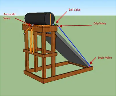 The solution includes a thermosyphon heating system with a redwood enclosure and claw foot bathtub, fitting the hostel's rustic theme, as shown in Figure 1. Attached to the redwood enclosure is a handrail for the guests' safety, and a small shelf. The platform is constructed of redwood, upon which the water tank will be placed. The solar collector is mounted on the structure at a 40 degree angle, allowing for maximum solar exposure. The plumbing consists of three ball valves and two drain valves, labeled in Figures 1 and 2, that can be used to isolate and drain the system. The anti-scald valve is used to set a maximum water temperature in order to prevent user injury. The drip valve prevents pipe cracking by releasing the system pressure as water in the system cools and expands. Water circulates through the system continuously through the process of natural convection. Cold water enters the system through the blue coldwater inlet seen in Figure 2.[1] Inside the tank cold water flows down the blue pipe seen in Figure 3 and enters the solar collector. Water inside the solar collector is heated by the sun and naturally flows to the top of the solar collector and back into the tank through the red pipe shown in Figure 2.[2] Hot water is piped from the top of the water tank, through the user temperature control, and finally provides a warm shower for the user.
