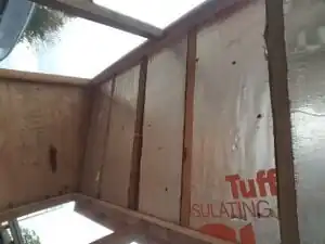 After the insulation is placed on all four built walls of the kiosk, place the inner layer of plywood, or material of choice, to enclose the insulation and 2"x2" framing. The only framing visible should be from side views. To enclose the roof, cut slots in a piece of plywood to the correct length of the roof to seal the top insulation inside.