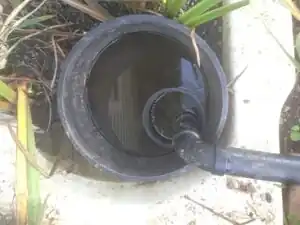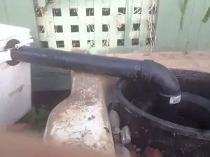 CONNECTING PIPE & PLANTER BUCKET IN TUB 1: The pipe from the second grease traps connect to an ABS elbow pipe that allows the pipe to go towards the bottom of the tub. This pipe resides 5" deep inside the planter bucket. Right underneath the output of the pipe is a screen 5" in depth so that they fit snug in the planter bucket. The planter bucket contains a series of small holes on the sides so water can seep out.