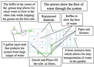 Grease Trap: For this grease trap our team used repurposed plastic buckets that are placed side by side and connected by a 5" long pipe at the bottom. These buckets are side by side because the "wall" in between the buckets acts as a trap for grease. Water is coming from the sink, meaning there is a large amount of grease in the water. In the first bucket, where water enters from the house, a screen 5" in depth lies on the top of the bucket. Inside this screen are a few layers of straw and other grease absorbing plants/material. The point of this first bucket is to trap the grease on the top of the water where the plants/material can absorb the grease. Less greasy water then travels through the 5" long pipe into the second bucket. Once enough grey water fills the second bucket it will flow into the first tub for further filtration.