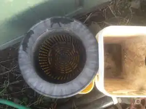 FIRST GREASE TRAP BUCKET: Inside this bucket is a screen 3"-4" deep. Grease is trapped at the top of the screen which contains straw and other grease absorbing plants. Less greasy water remains at the bottom of the bucket and passes into the second bucket through a pipe 1" above the bottom of the bucket.