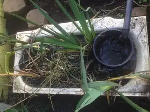 Tub Two: The water entering from tub one then drains into tub two where a similar set up as tub one is in place; however, smaller gravel and large rooted plants(e.g. blue iris) were used. Once the water travels to the opposite end of the tub, water flows out of the tub and through a connection where water can drain, or a hose can be attached.