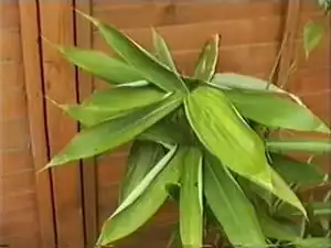 One of the more than 1000 species of bamboo. A medium sized plant with very large leaves which grows to around 2 metres. Calms green with brown speckles on older canes.