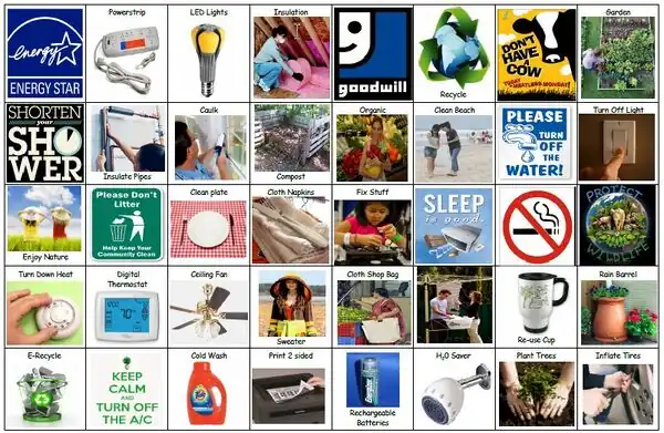 These are good deeds you and your family can do around your home. As most of them save physical resources, they not only shrink your environmental impact, but they also will save you money. The white bordered pieces:
