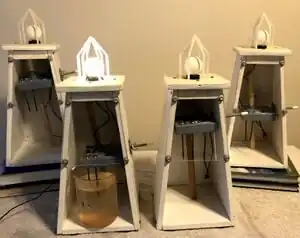 The Lighthouse Conductivity Meter is a probe used for measuring the conductivity of a liquid solution. The design consists of a wooden body with a 3D printed, PLA rooftop housing. Inside is a probe block that slides along a dowel to lower two probes into a solution. The probes are connected to an electrical circuit that lights a lightbulb at the top of The Lighthouse if the solution has a enough electrolytes to carry the current across the solution. The bulb increases in brightness with increasing conductivity.