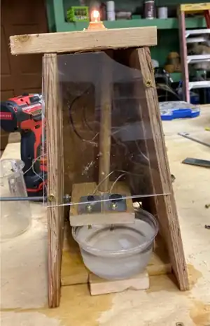 To operate the Lighthouse Conductivity Meter, first ensure that the galvanized nail electrodes are making metal contact with the probe block. Do this with the meter unplugged to avoid any small shocks. Next, plug in the meter, and place a solution in the base. Unscrew the wingnut on the side one full turn, and use the handle to lower the electrodes into solution. After observing any luminosity, raise the probe block back up and re-tighten the wingnut. Unplug the meter, and wipe down the electrodes to minimize rust build up.