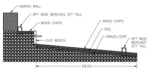 The final design of the outdoor teaching area includes four 9 foot long benches that can fit up to five students each. These benches were made from cedar wood and painted to protect them from different weather conditions. Two benches are placed in the upper area and two benches are placed in the lower area. A path to the upper area of seating was cleared and wood chips were placed across the entire area to prevent mud from being tracked back into the school. With this design, the teaching area is not able to seat an ample amount of students and is more accommodating to different types of classes.