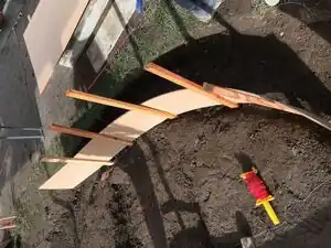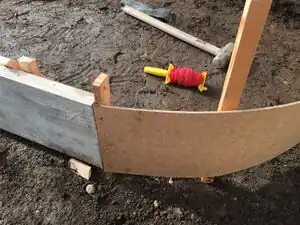 The outer masonite sheet was curved one foot away by the spacers from the inner curve and drilled into the stakes.