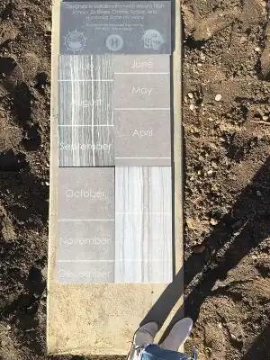 - the calendar months are a raised platform in the middle of the sundial. consists of a 2' x 6' slab of concrete with laser-etched patio tiles.