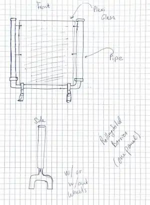 Various prototype barriers were created and tested throughout the design process. Two scale models were created to test for appeal, when presented to test subjects they were received very well so a full size model prototype was created. The purpose of the full size prototype was to test function, it was made with a large wood frame and cardboard barrier material. After testing the function of the barrier using a spray bottle and measurements of indirect airflow it was determined that the barrier did not need to be so large.