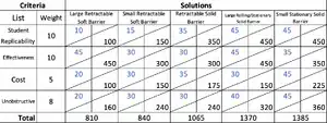 - Cost: Another criteria for the final design was that it remained within a chosen budget. CMF Design designated $150 to be the most that a single unit should cost to build. The team wanted to ensure that no undue burden was placed on SRCHS in recreating the final product, if they choose to do so. It was known that the school would have to build multiple barriers, and knowing this, the team wanted the cost for each to be kept low.