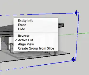 You can use this tool to "cut" through your model, to make cross-cut plans, ... You find this tool at the bottom of the "Large Tool Set", or via the Menu: Tools -> SECTION PLANE. Once this tool has been activated, a green blade hangs off the mouse pointer. You can place this blade on each surface (in any direction) by simply clicking on the desired surface.