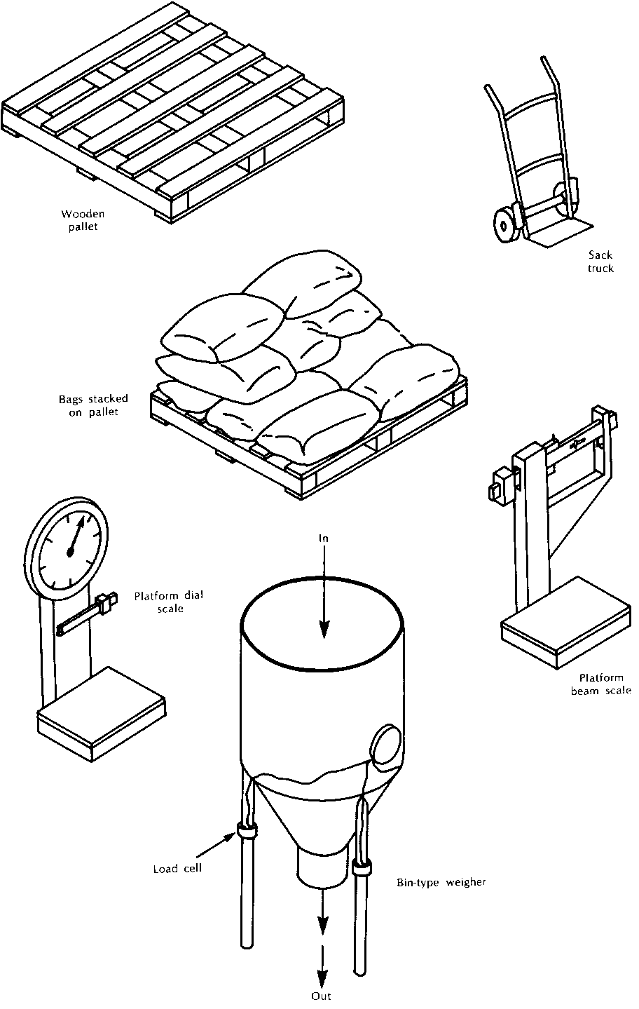 Storage areas must be waterproof and well-ventilated, and provide protection against infestation by insects and vermin which can quickly cause substantial losses in weight. If materials are to be stored in bags they should be kept in a building having a concrete floor. The roof and walls need only to be lightly constructed provided that they are pest and waterproof. The bags should be stacked a few inches above floor level, for example, on wooden pallets (see Figure 1), and away from walls. Raw materials may also be stored in bulk either in silos constructed from concrete or steel or in bins formed with partitions in conventional stores. Bulk storage normally entails a greater investment in capital equipment but lower operating costs. If raw materials are to be stored in this way it is essential that the bin manufacturers are informed of the raw materials to be handled, since some raw materials which have poor flow characteristics tend to form bridges of material in the bin base thus preventing their discharge. In general, raw materials of low bulk density have poor flow characteristics and those of high bulk density have good flow characteristics. Raw materials which have poor flow properties normally require large diameter augers for their transfer.